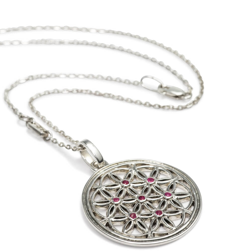 Der magische Blume des Lebens Anhänger besteht aus einer ausgewogenen Struktur gleichförmiger Kreise, die sich harmonisch „zu einer heiligen Geometrie“ überschneiden. Dieses Ornament wirkt wie ein unendliches Meer von Blütenblättern, das wir mit leuchtenden Rubinen veredelt haben. Drei Außenkreise umschließen das harmonische Blütenmuster und versinnbildlichen Körper - Geist – Seele, ein elementarer, energetischer Abschluss. Handwerklich aus feinstem Sterling Silber hergestellt, kann er uns Schutz und Energie geben.