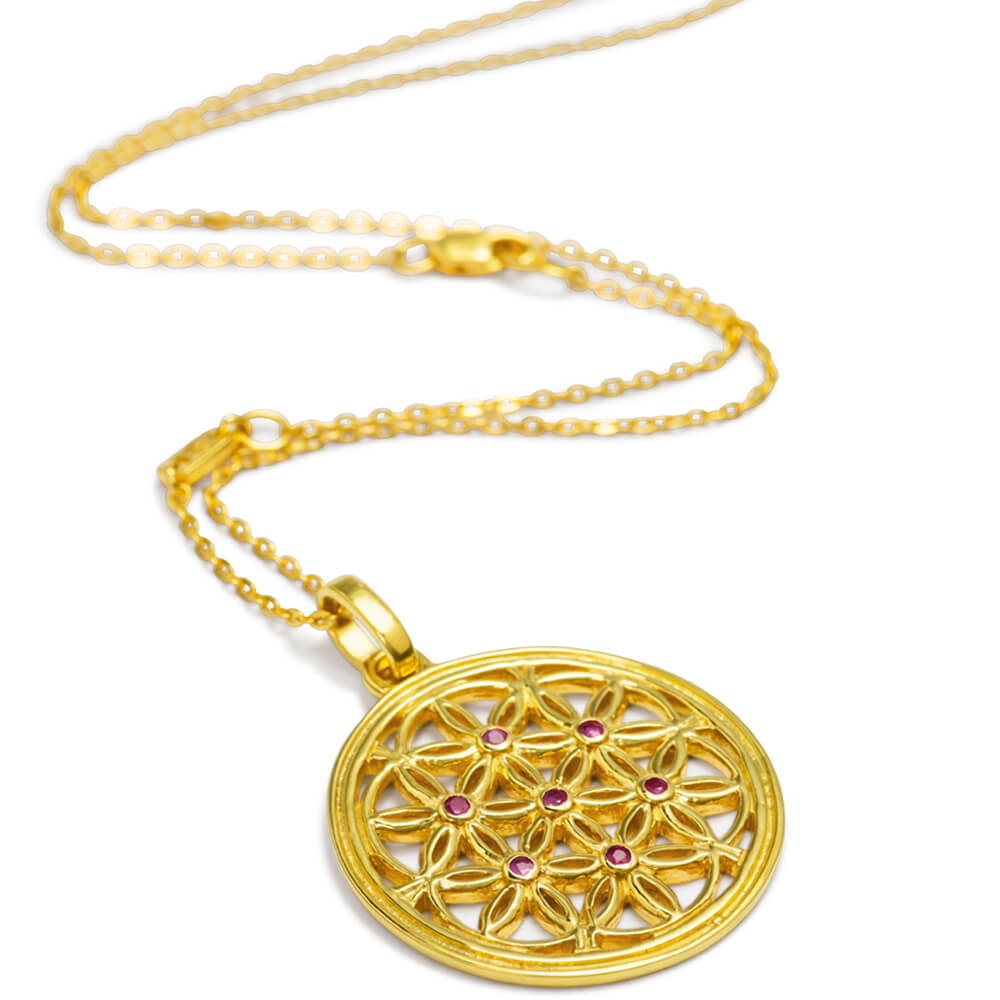 Wähle zwischen der Blume des Lebens Kette mit Rubinen, eine Kombination aus Anhänger und glänzender Ankerkette in 2mm Stärke oder dem einzelnen Blume des Lebens Anhänger.