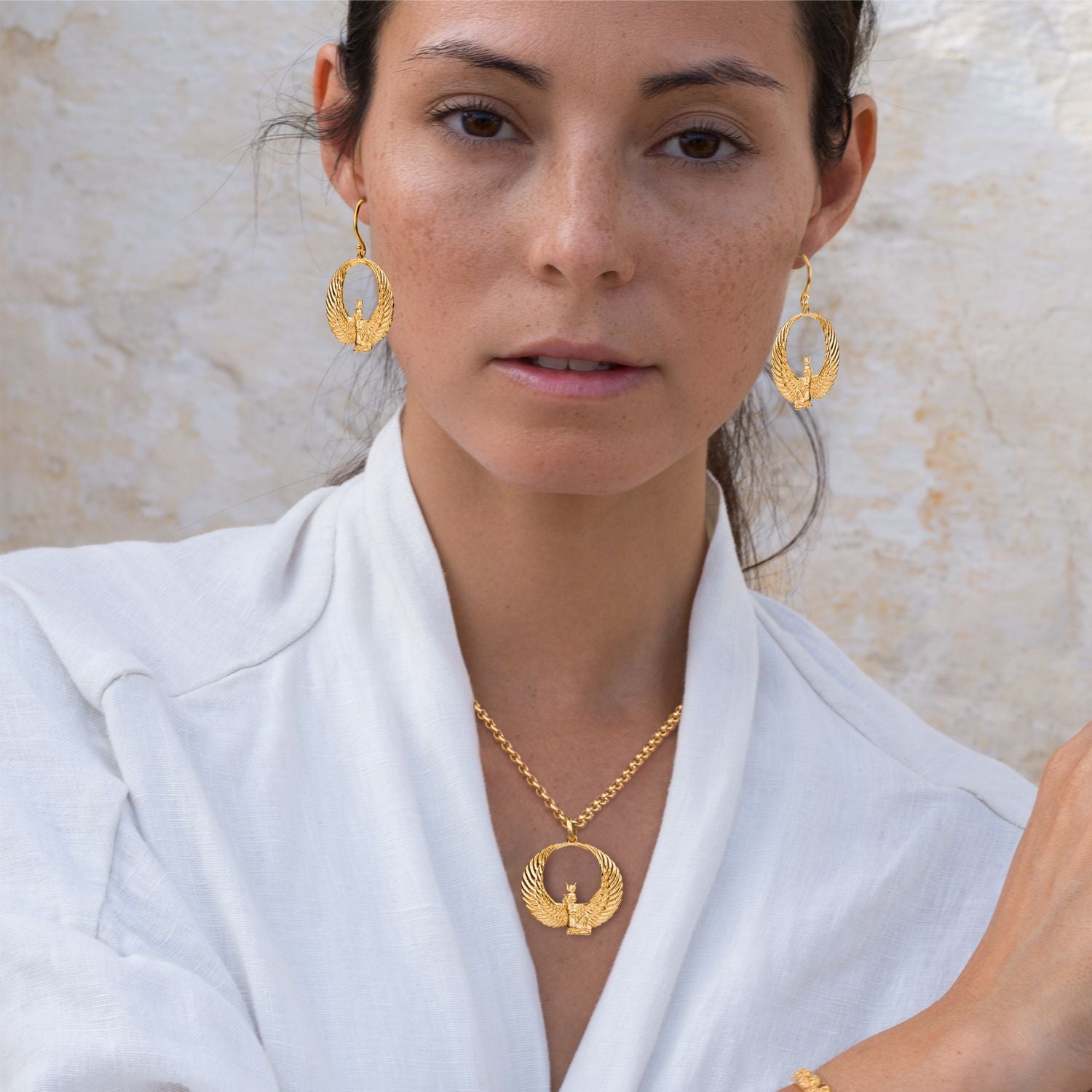 Die klassische Darstellung der Göttin mit den weit ausgebreiteten Flügeln, inspirierte uns zu unserem handgefertigten Anhänger. Die kreisförmig zusammengeführten Flügel, symbolisieren die Dynamik und Energie der Göttin, zwischen den Schleiern der Realität zu gleiten um die Wahrheit zu erfahren. In ihrer filigranen Krone trägt sie einen klaren Bergkristall. Auf der Rückseite sind die ägyptischen Hieroglyphen der mächtigen Göttin eingraviert.