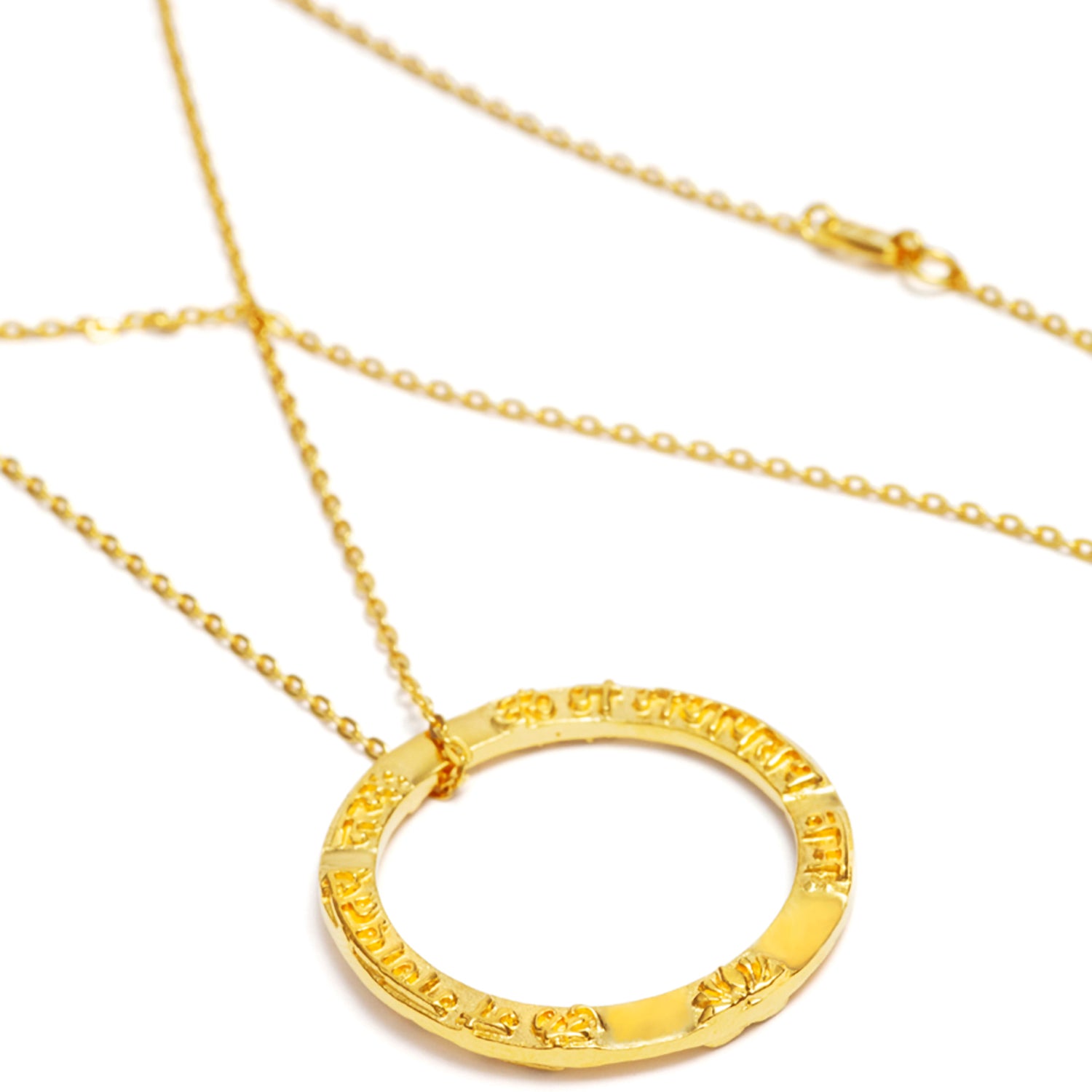 Dieser vergoldete Ganesha Mantra Anhänger ist der schlichteste in unserer Ganesha Mantra Kollektion. Da die Kette durch die Mitte gezogen wird, bleibt seine Kreisform unberührt. Ein in Größe und Gewicht sehr schönes Schmuckstück, das uns das Ganesha Prinzip des Glücks eröffnet und Reichtum, Erfolg und Wohlstand erzeugt. Ursprünglich designt im Sinne der Tibetischen Gebetsmühle, wo jede Drehung einer Mantra Rezitation entspricht.