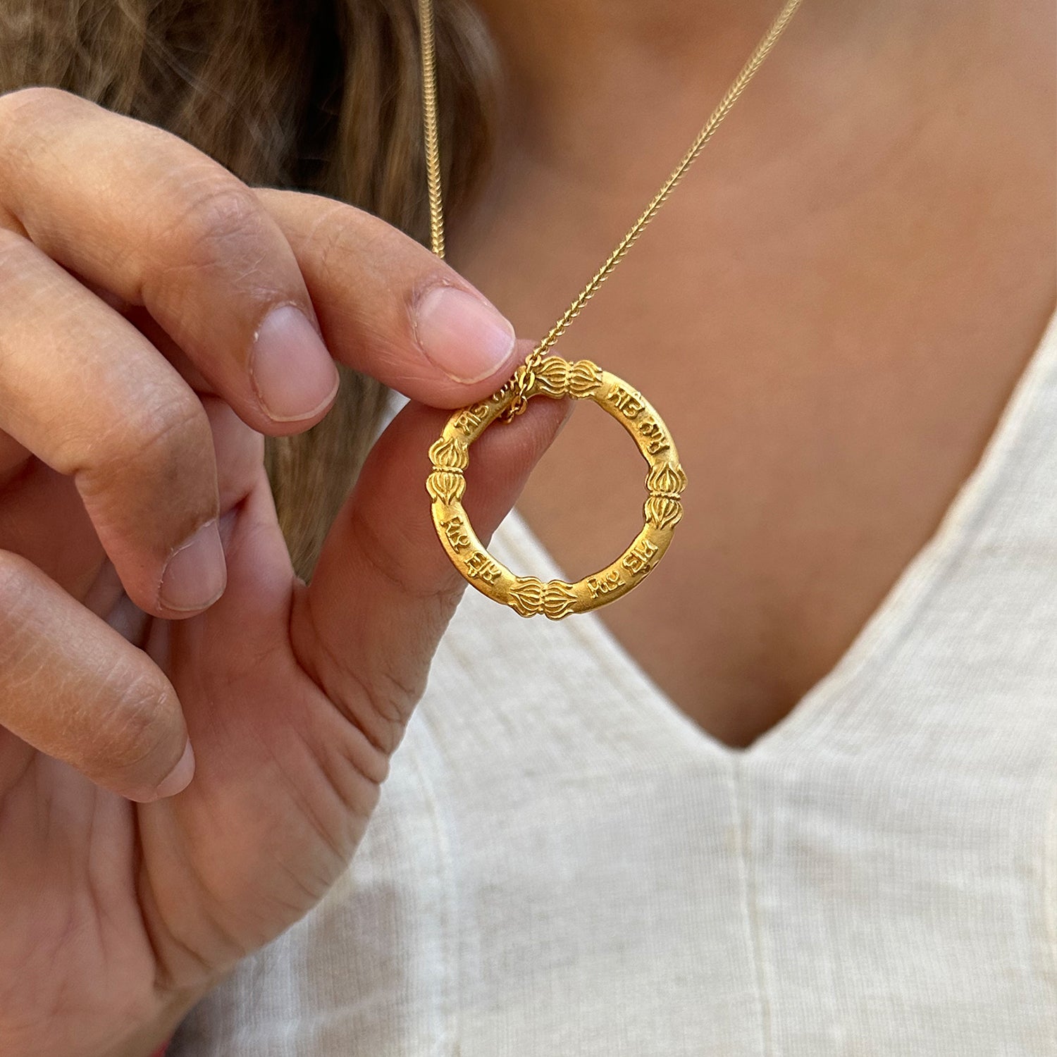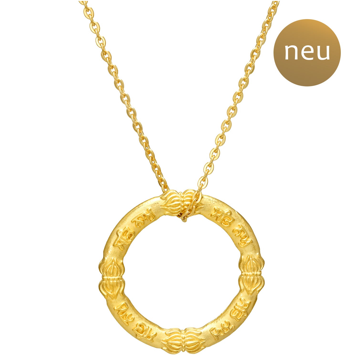 Im Mittelpunkt dieses Schmuckstücks steht das Mantra SAT NAM, was „Wahrheit ist meine Identität“ bedeutet. Umrahmt von vier doppelten Lotusblüten, universelle Symbole für Reinheit, Klarheit und geistige Erleuchtung, spiegelt deren besondere Anordnung zudem die liegende Acht wider, ein Zeichen der Unendlichkeit.